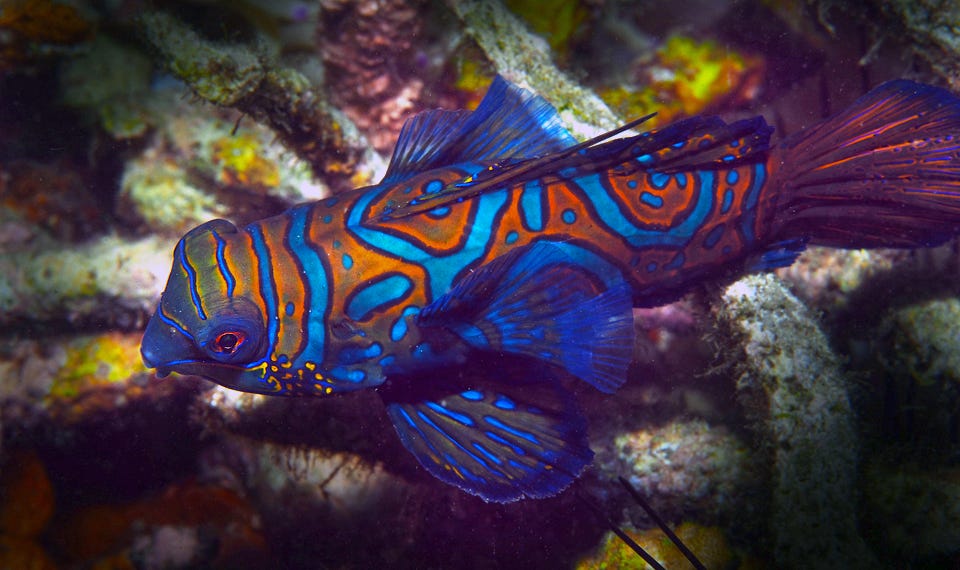The Mandarinfish (Synchiropus splendidus) features one of the most striking bluish hues in nature. But they are typically difficult for divers to spot as they are bottom-feeders who only measure 6 cm (2.3 in) long.