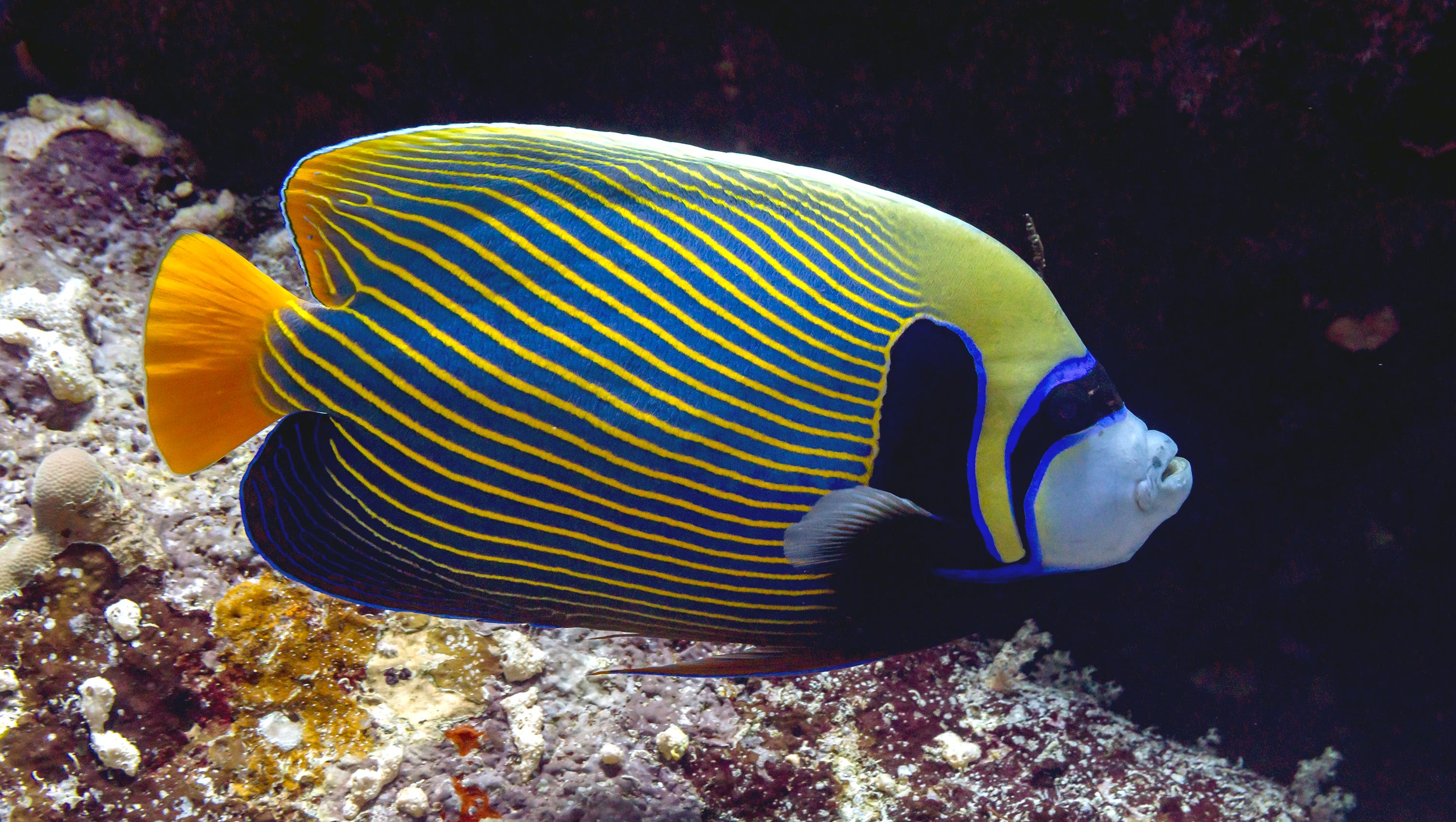 The Emperor Angelfish (Pomacanthus imperator), is favorite of reef photographers and aquarium collectors due to its vivid, rich coloration. Adults are found in the shallow waters of clear lagoons; the juveniles prefer the protection of deep caves.