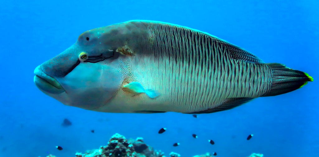 The Humphead Wrasse (Cheilinus undulatus) is the largest fish in the wrasse family, reaching up to 2.5m (8.2 ft) long. It feeds on small invertebrates like mollusks and starfish.