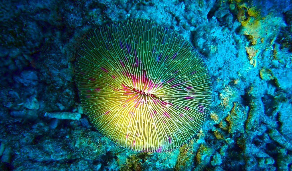 Mushroom Coral (Fungiidae fam.) are a diverse group of corals that contain thirteen extant genera. They are typically solitary animals, that live apart from the larger reef.