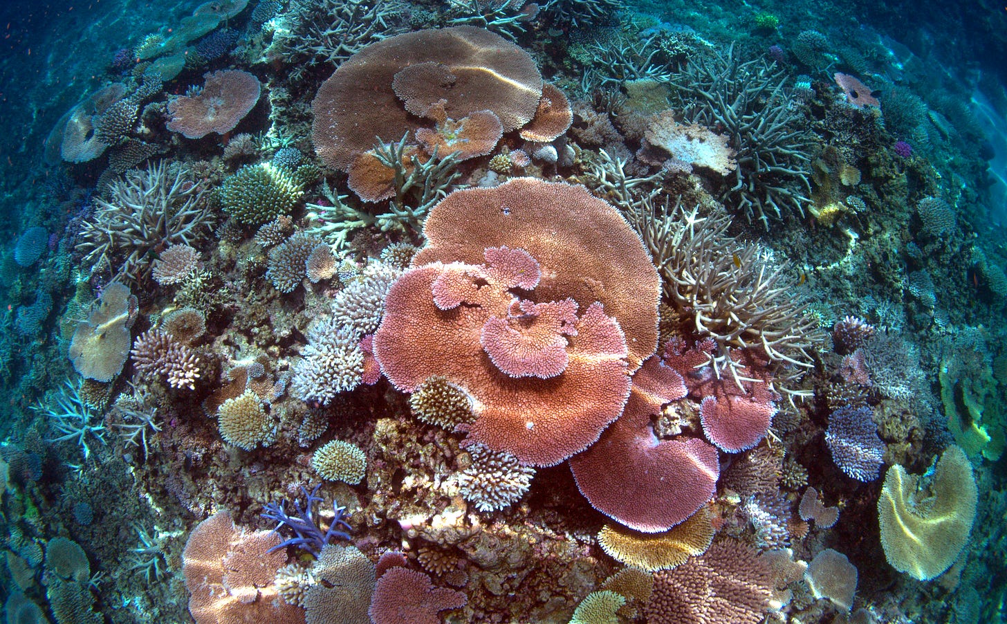 Table Coral (Acropora hyacinthus) forms long, table-shaped colonies in shallow depths. They are among the fastest growing of all coral, and their flat, plate-like structure highlights the display of vivid colors.