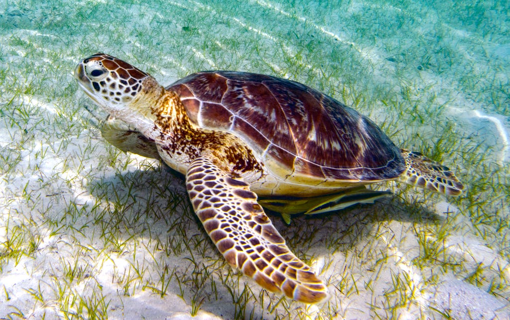 The Green Sea Turtle (Chelonia mydas) is a massive sea turtle that can reach 1.5 m (5 ft) long and 190 kg (419 lb) in weight. It feeds exclusively on seagrass, whose consumption gives the species its name by turning its fat a bright shade of green.