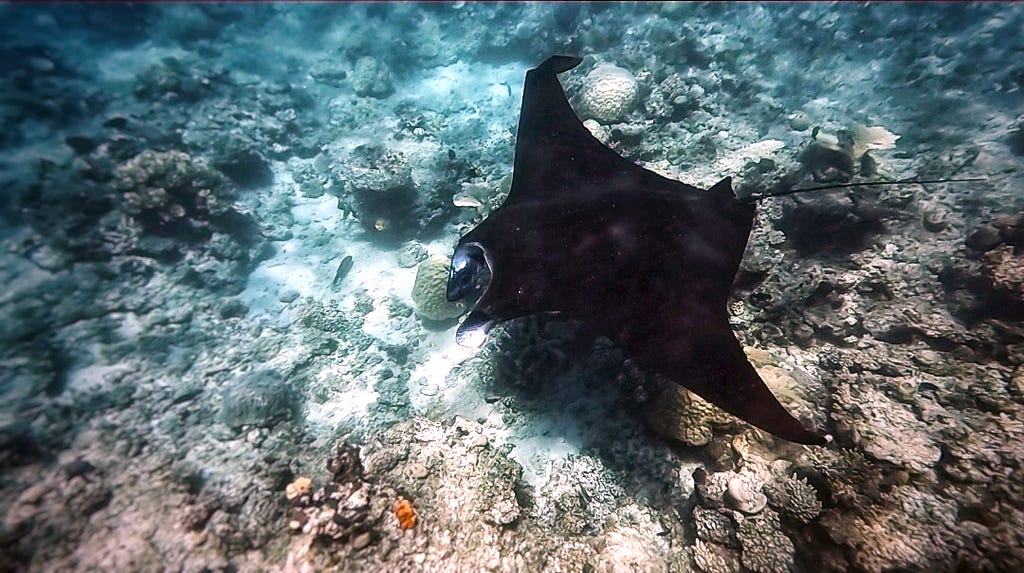 The Reef Manta Ray (Mobula alfredi) is one of the largest species of ray in the world, regularly measuring 3.5 m (11.5 ft) in disk width. They are filter-feeders who can dive up to 672 m (2204 ft) in search of food. They boast the largest brain-to-weight ratio among cold blooded fish and are known to form social communities.
