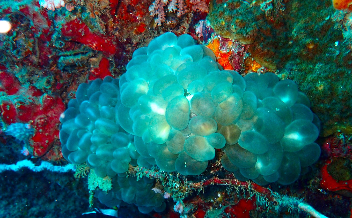 Bubble Coral (Plerogyra sinuosa) are known for their grape-sized “bubble” vesicles, which expand and contract depending on light levels. Their colonies can measure up to 1 meter (3.3 ft) across.