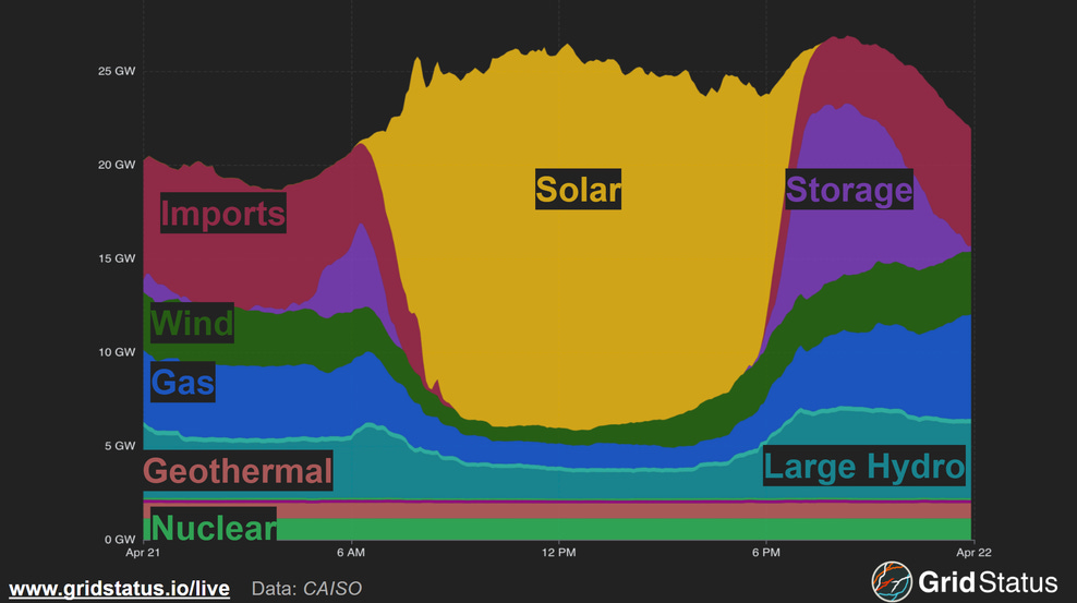 At low penetration rates, this problem hardly matters. There is a demand peak during the day, which solar is well-suited to absorb. Grid operators can easily balance small amounts of variable resources by importing excess electricity from elsewhere or spinning up a fossil gas peaker plant. There is also a small balancing effect between renewables, as solar generates during the day, and winds tend to be stronger at night.