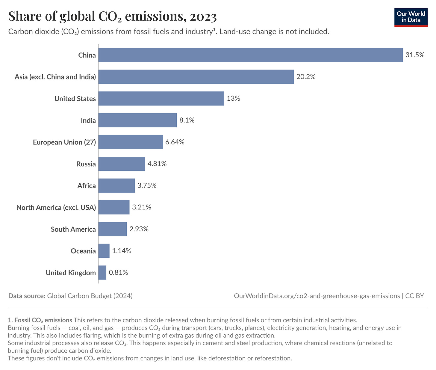 In 1950 the United States represented 43% of global carbon emissions. In 2024 it represented only 13%. The projected slowdown in US decarbonization due to the OBBB would thus make very little direct difference in a world where emissions are dominated by China, India and other Asian countries.