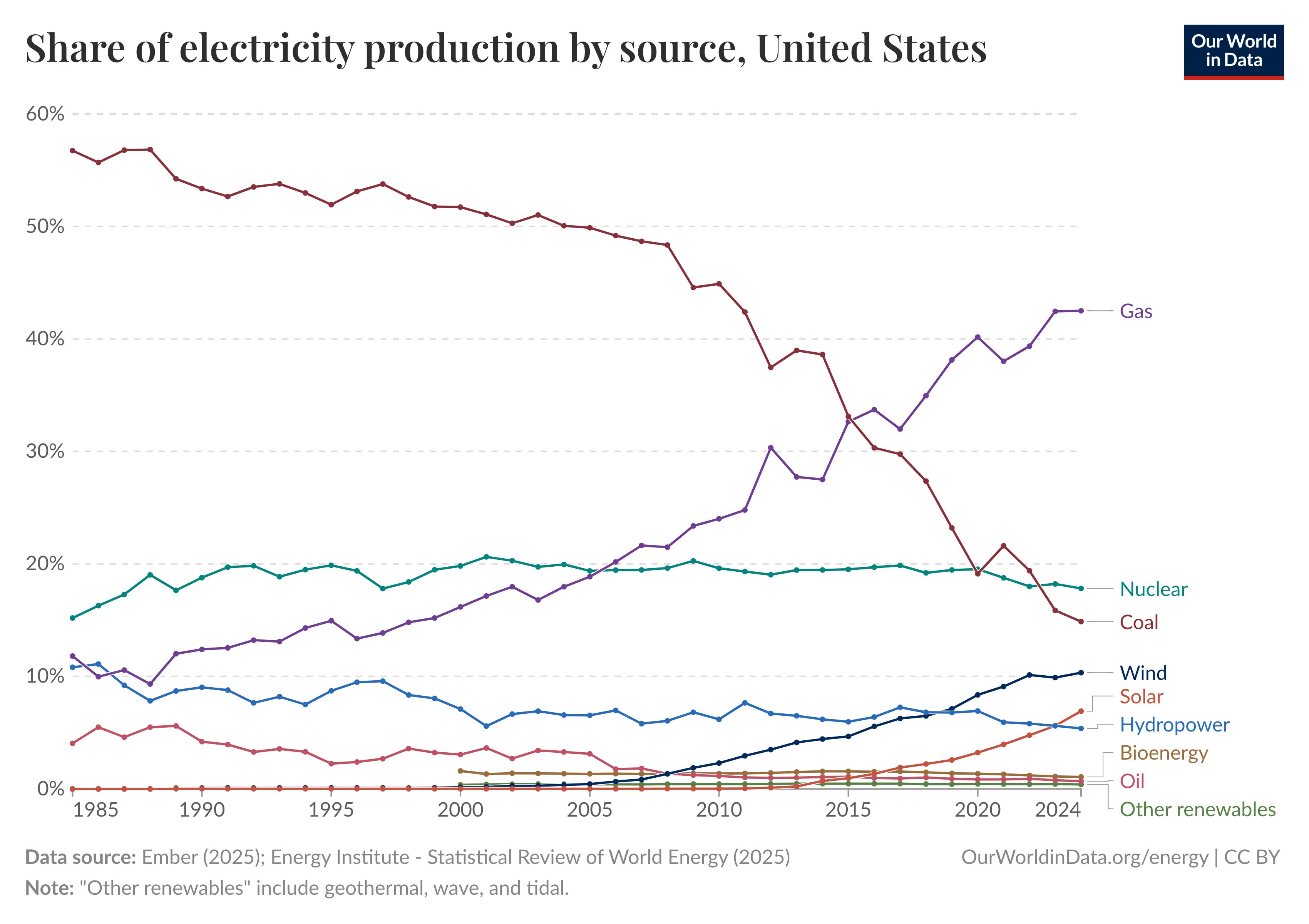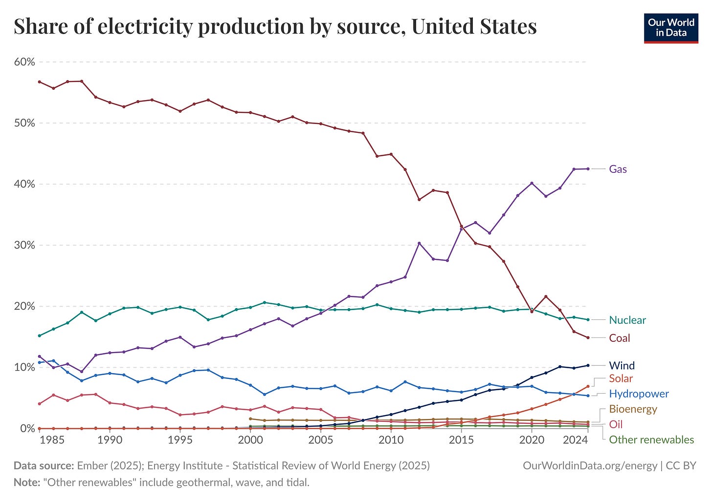 Coal is the most polluting of all the fossil fuels, contributing significantly to carbon emissions and local air pollution. In the year 2000 coal produced 51.7% of electricity in the United States. That same figure in 2024 was only 14.9%. Kentucky, West Virginia, and Wyoming still burn a lot of coal for what one might charitably categorize as “heritage” reasons. Everyone else has moved on from coal or shortly will do.