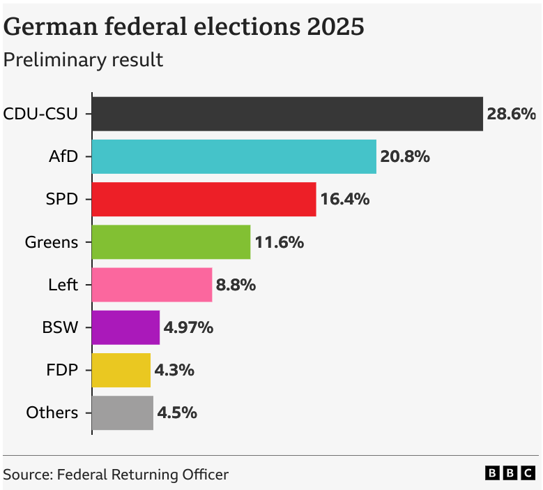 According to preliminary results via the BBC, the centre-right CDU/CSU led at 28.6%, the AfD came in second at 20.8%, followed by the centre-left SPD at 16.4%, the Greens at 11.6%, and the hard-left Die Linke party at 8.8%. All other parties scored beneath the 5% threshold to gain seats in the Bundestag (federal parliament).