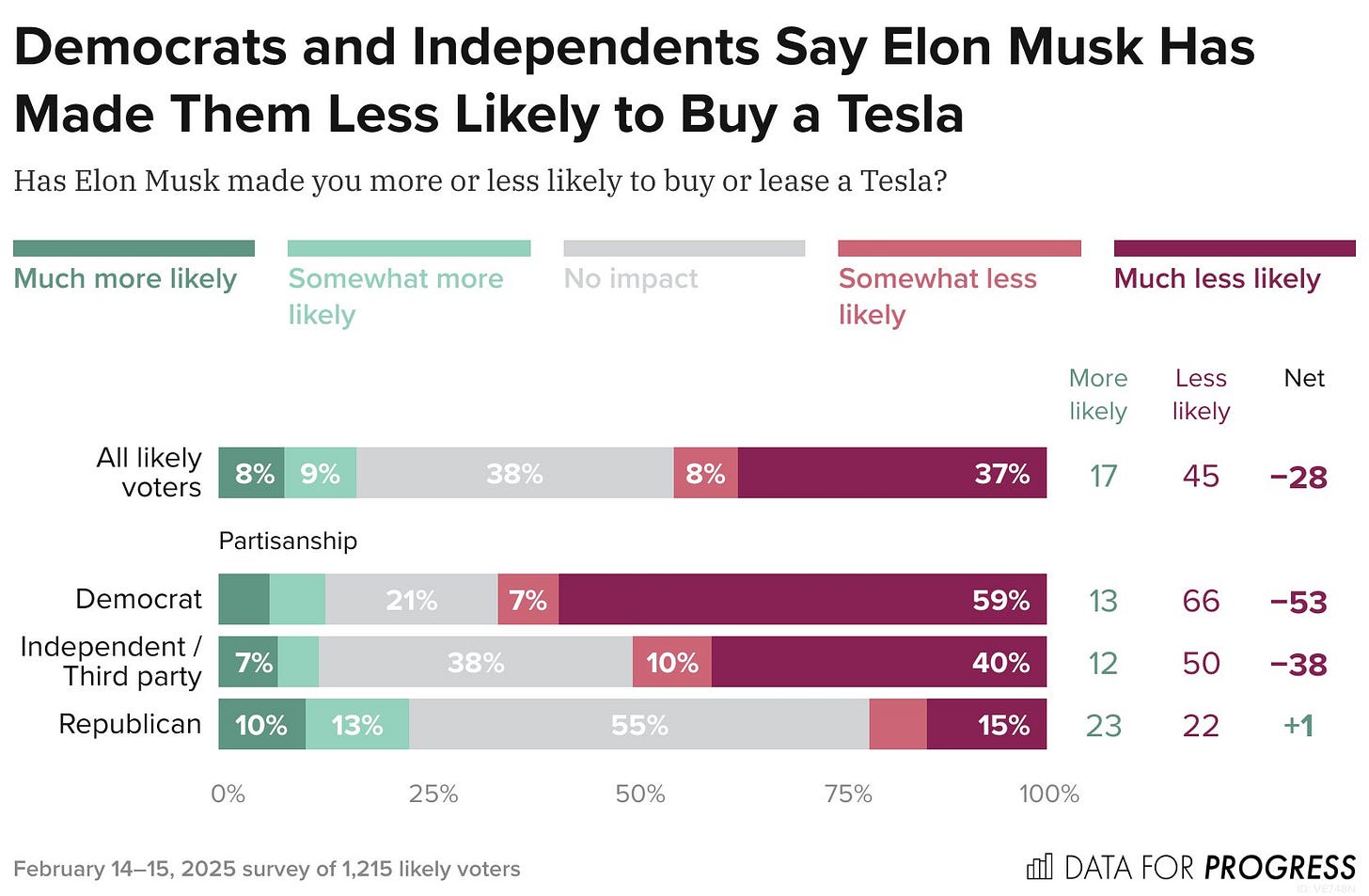 By the time it’s over Elon’s meddling in politics is unlikely to be popular with any group of Americans, not even die hard MAGA conservatives. There is a reason why the U.S. Congress’ approval rating typically hovers between 15% - 25%. As the body that determines where and how tax dollars are spent, it gets blamed for every grievance in America. As Musk’s DOGE illegally usurps Congress’ constitutional power of the purse, his approval rating - and that of his flagship company - will likely end up in Congress’ range.