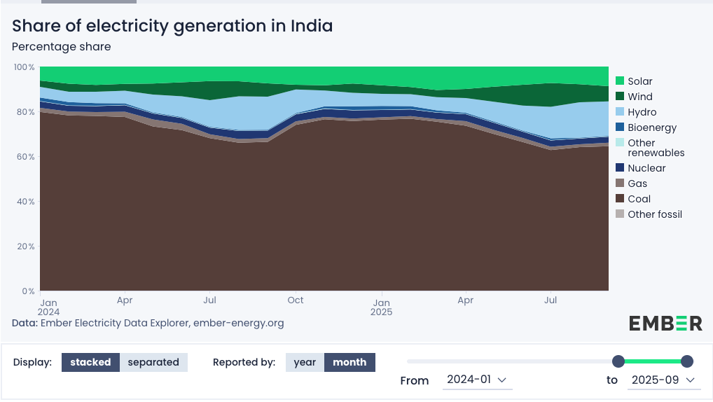 Coal is on a downward trend in India, according to energy thinktank Ember. India is the second-largest burner of coal behind China, but increased solar, wind and hydro generation have decreased coal’s share of electricity production by several percentage points below last year’s levels.