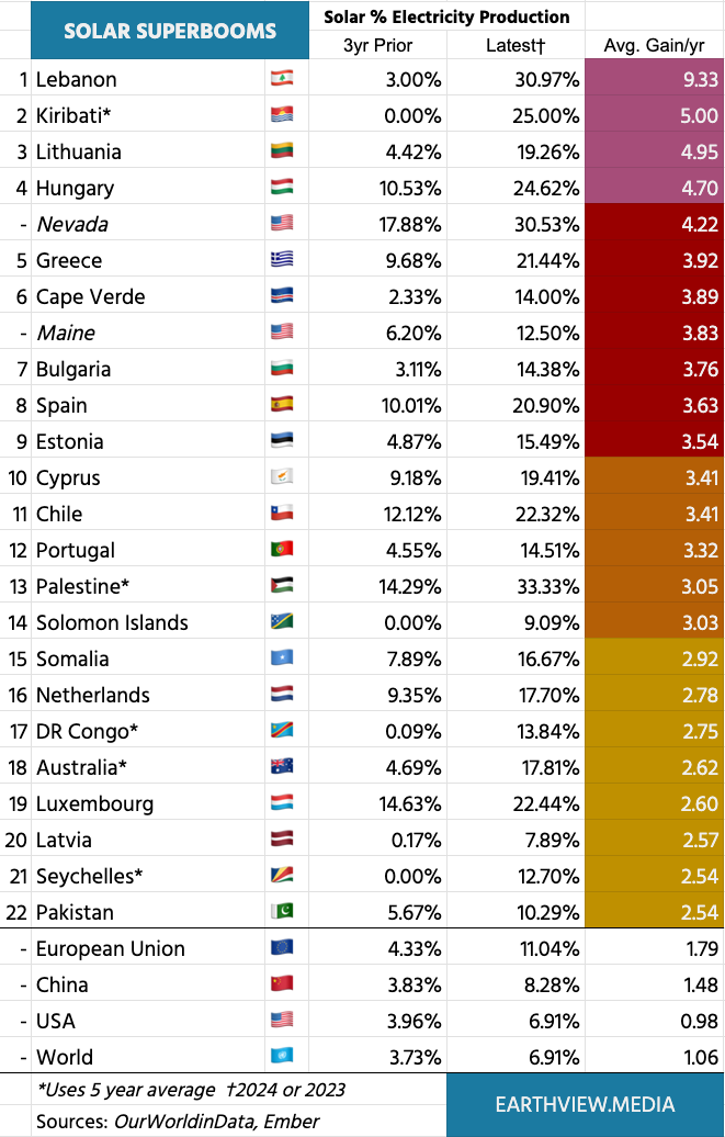 By far the most consequential nation in this group is Pakistan. Although it ranks low on the 3-year average list, that’s only because its solar boom is so new. It was among the fastest-growing in 2024 and is the most populated of the superboomers with 240 million people.