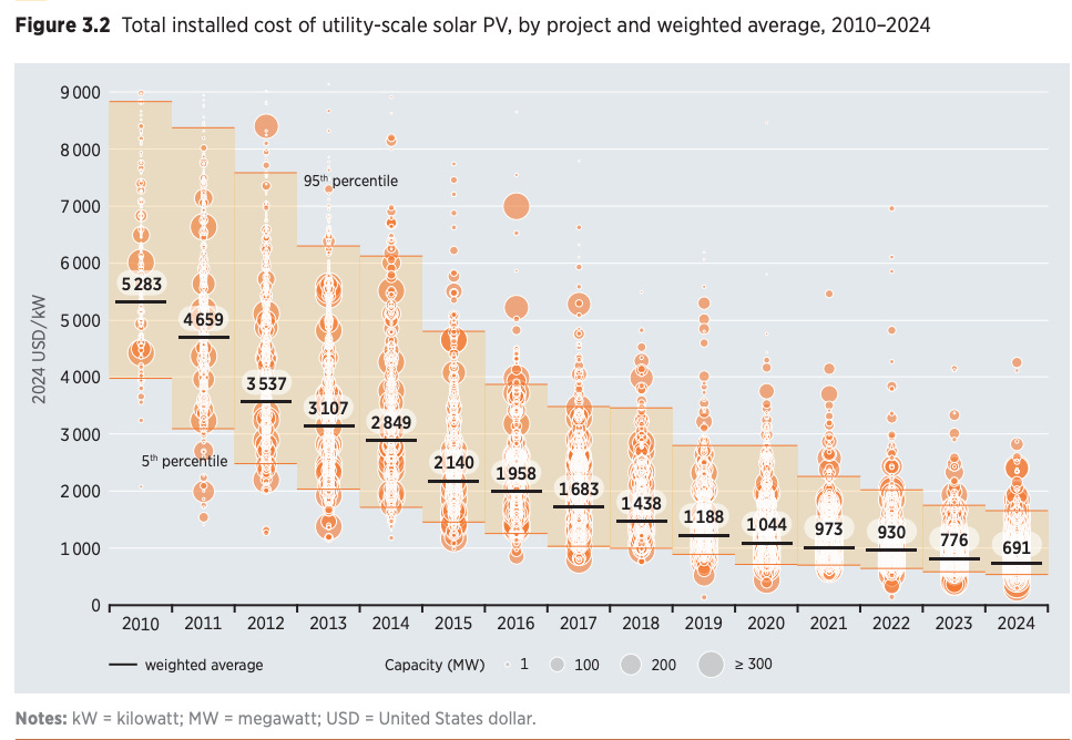 Solar panels are mass-produced manufactured products, and as such they benefit from economies of scale to a greater degree than fossil fuels or nuclear. The installed cost of a utility-scale solar plant has declined 87% since 2010 and 34% since 2020 (see chart) and are projected to decline further.