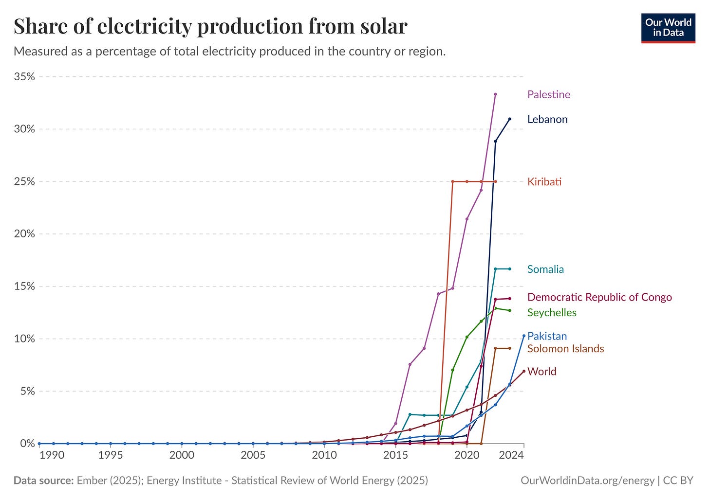 Now they increasingly rely on solar. Solar’s share of Lebanon’s electricity generation has skyrocketed from nearly nothing in 2020 to almost one-third today, driven primarily by rooftop installations on homes and businesses, which use solar + storage to opt out of the failing fossil grid.