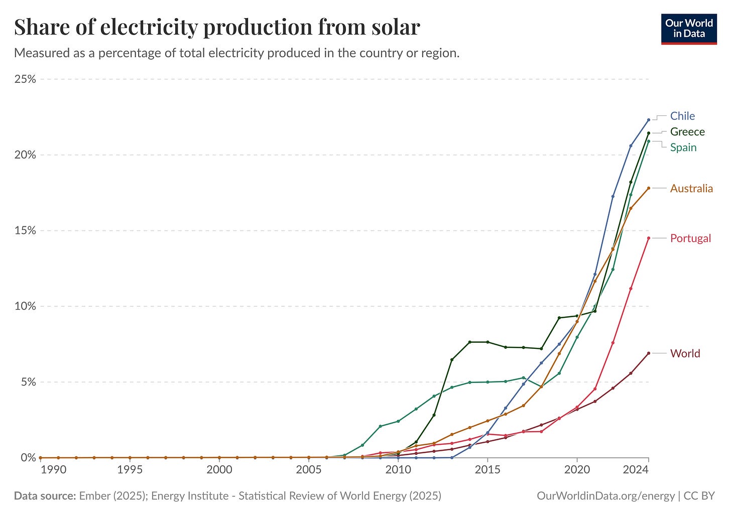 Australia’s solar revolution is double-barreled, relying on both rooftop and utility-scale projects, with utility-scale accounting for 10% of the country’s electricity generation in the first half of 2025 and rooftop providing an additional 12.8%.9 Fully one-third of Australian homes now have solar panels on their roofs, the highest figure in the world.10