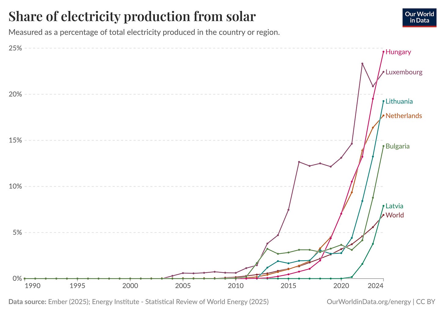 Hungary is perhaps a surprising name in this group. It is not particularly sunny and is governed by a long-serving, populist, right-wing government of the sort that - in the Anglophone world - would gleefully oppose renewable energy. But Hungary lacks fossil fuel resources of any kind and its energy security strategy has been to go all-in on the only two homegrown options available - nuclear and solar.