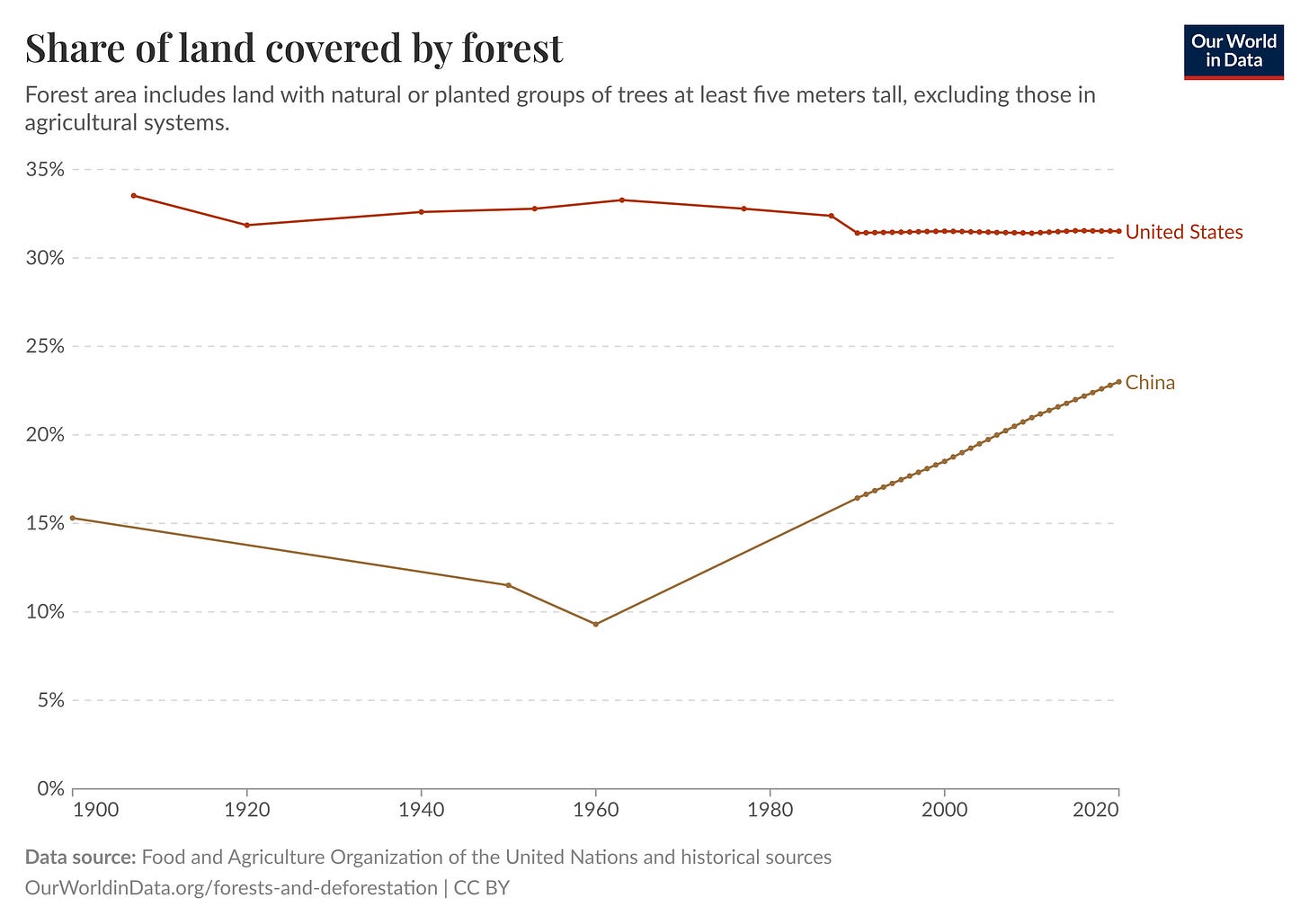 Although deforestation remains a problem in much of the developing world, China is a bright spot. The Chinese government launched massive reforestation and afforestation projects in the 1970s, which have successfully reversed centuries of forest decline.