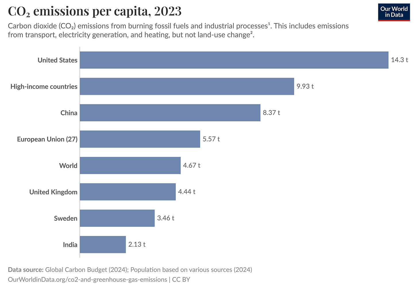 And the UK’s carbon emissions are not only low relative to its coal-dusted past. They’re also low on a per-capita basis relative to most other countries. At 4.4 tonnes per person in 2023, the UK’s emissions are less than one third the United States’, around one half of China’s and significantly below the European Union average. The UK is now nearly equal to nuclear-rich France and closing in on Sweden, the ne plus ultra of a large, highly decarbonized developed country.5