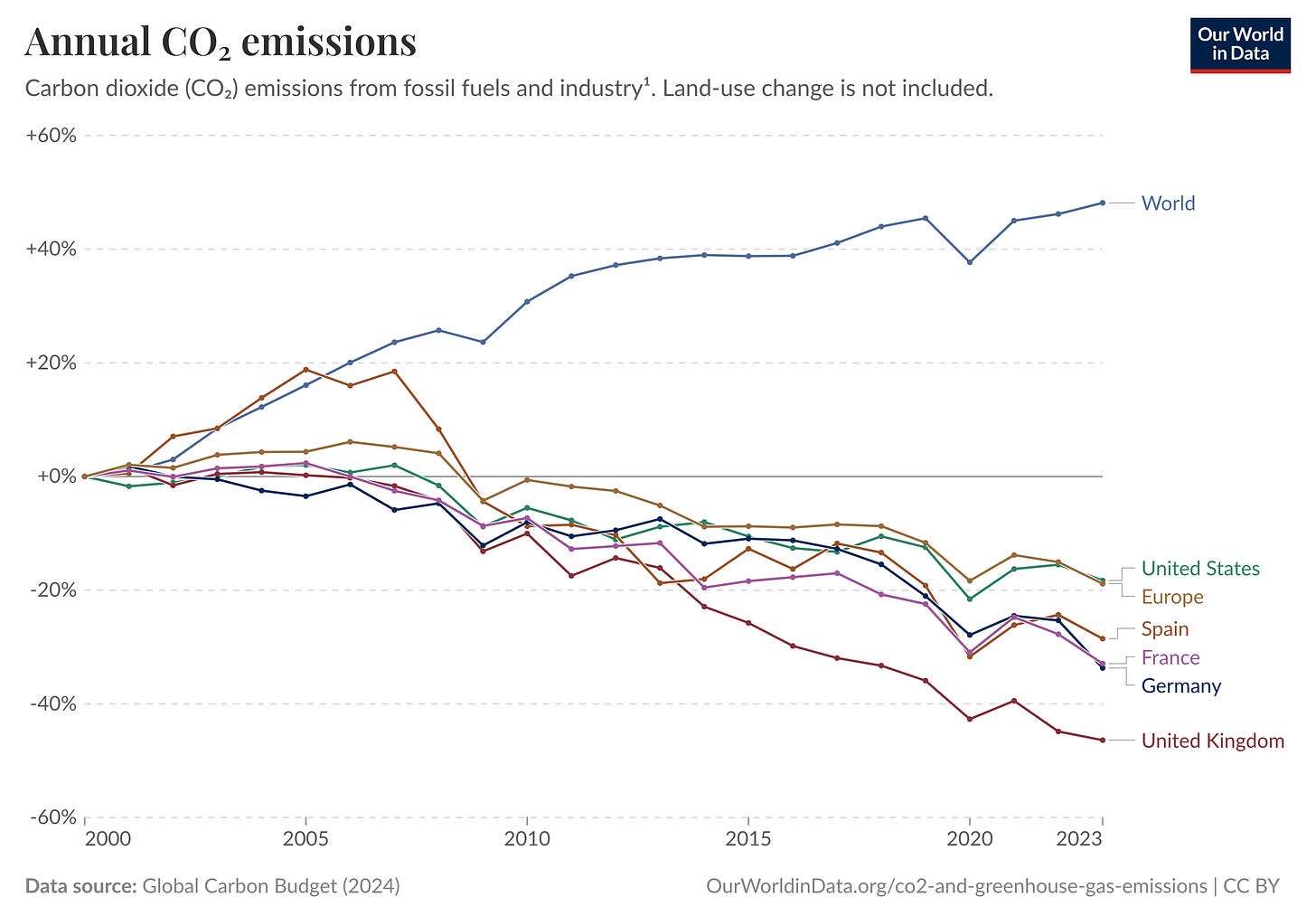 Between the year 2000 and the end of 2023, the world’s carbon emissions rose 48%, led by China at 226.2%, India at 210.4%, and Indonesia at 160.6%. The UK’s carbon emissions - by contrast - fell an astounding 46.4% over the same period, outpacing any other G7, G20, or Commonwealth country. Indeed, Britain’s emissions progress has outpaced any country in the world bar Denmark or places whose economies have been destroyed by conflict (Ukraine and Syria).4