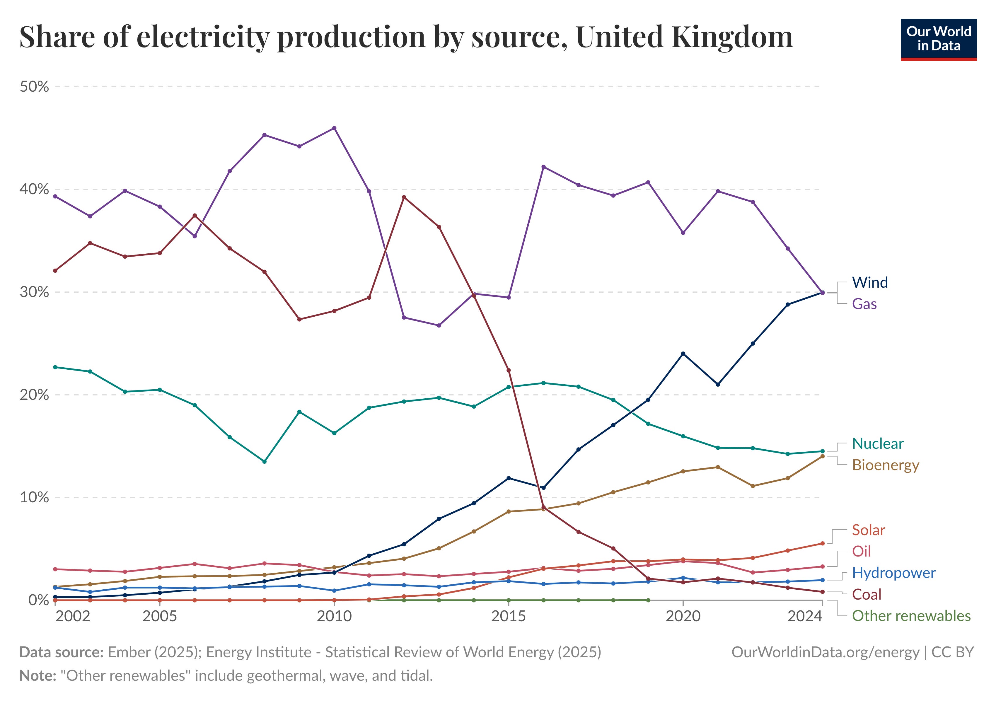 Wind power is now the UK’s largest source of electricity generation at 30% in 2024, edging out fossil gas. Nuclear provides 14.5%. Solar trails at 5.5%, but is growing rapidly.6 Offshore wind in particular is a vast resource that has only begun to be explored, and will greatly expand in future. The UK has enough practical offshore wind potential to meet the nation’s electricity demand seven times over.7