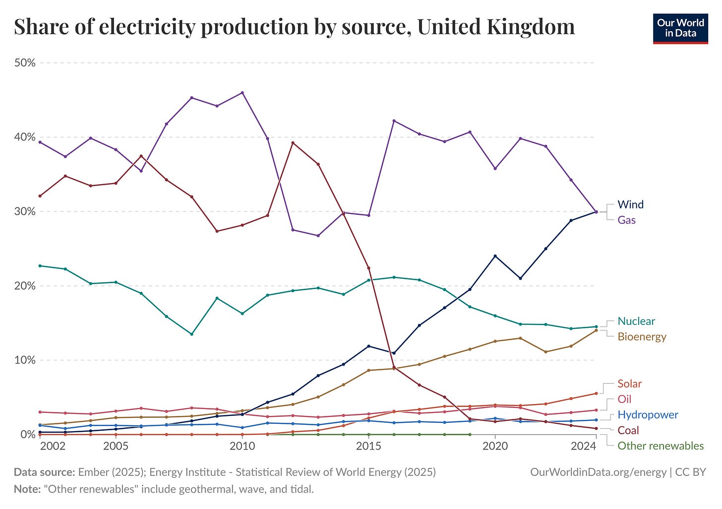 The UK invented the coal-fired thermal power station, the world’s first opened in London in 1882. Coal powered Britain’s industrialization from the Victorian era onwards and generated 39% of the UK’s electricity as recently as 2012. In 2025, it will generate 0%. The last coal-fired power station in Britain closed last year.