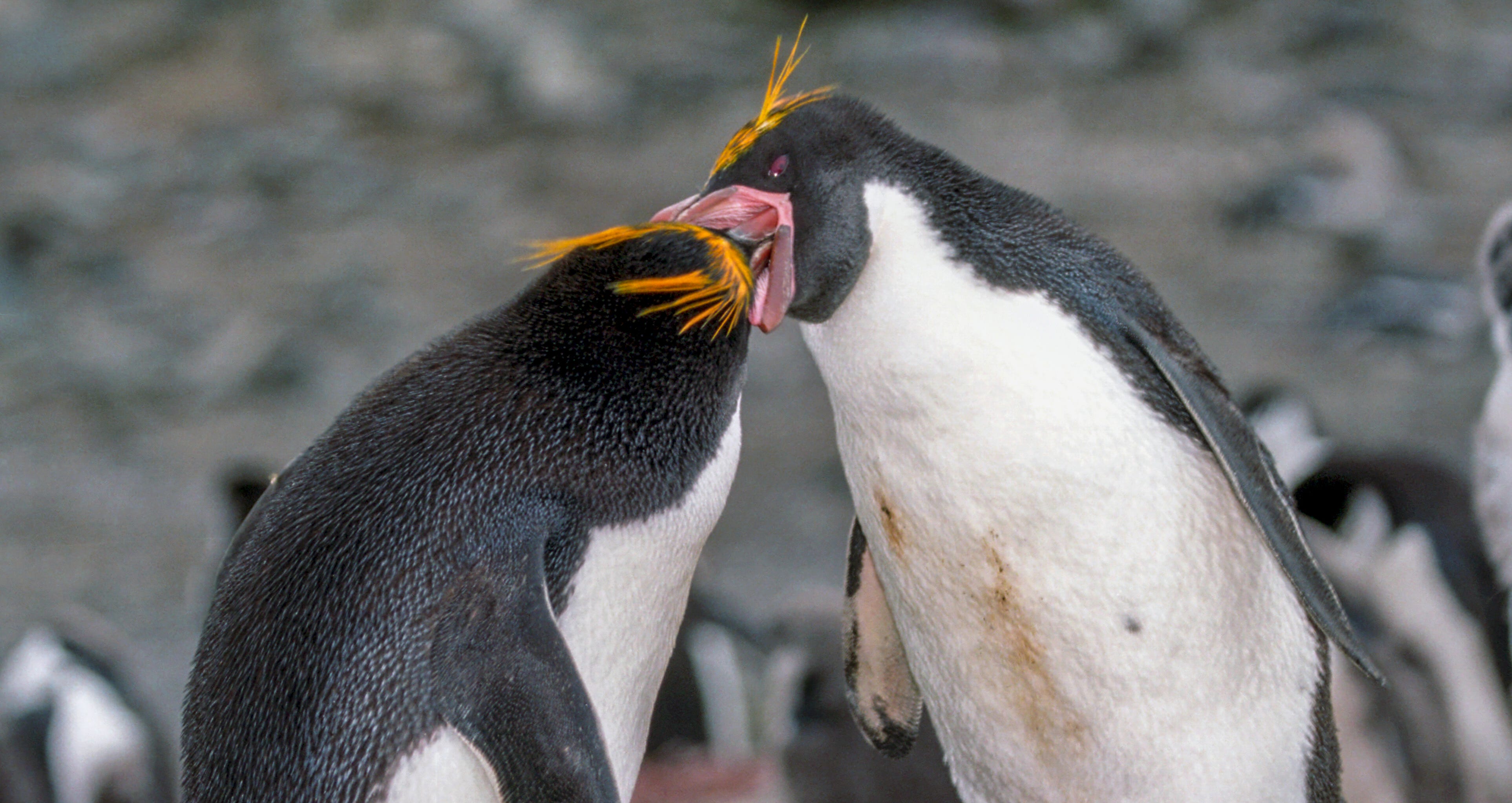 Macaroni Penguins spend much of their lives alone at sea. In a short window in late October and early November, they return to their breeding grounds on various Sub-Antarctic islands. There they rediscover their lifelong mate, whom they greet with an elaborate reunion dance.
