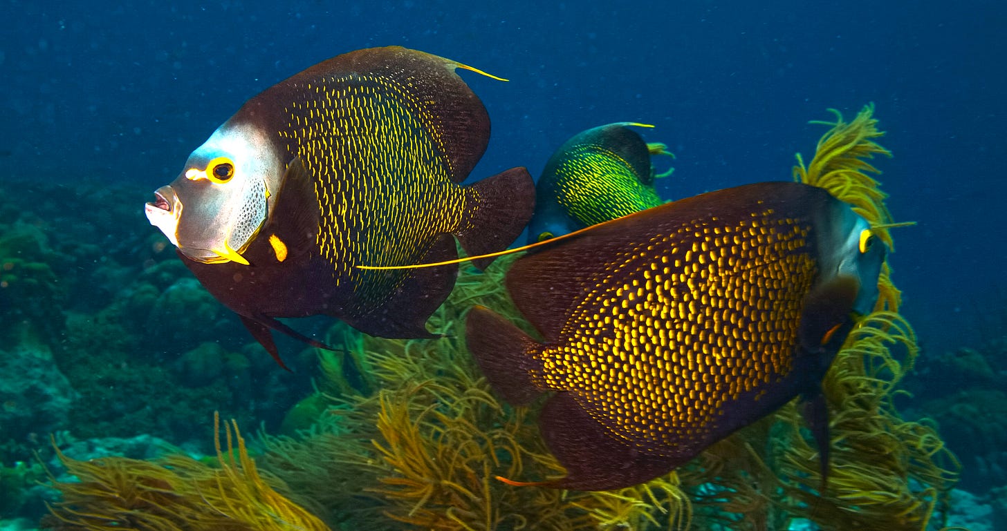 The French Angelfish is a rare example of monogamy among fish; individuals spend most of their lives swimming within inches of their partner. Pairs mate every day, sneaking off towards the surface to release their sperm and eggs into the water column simultaneously in a choreographed dance.