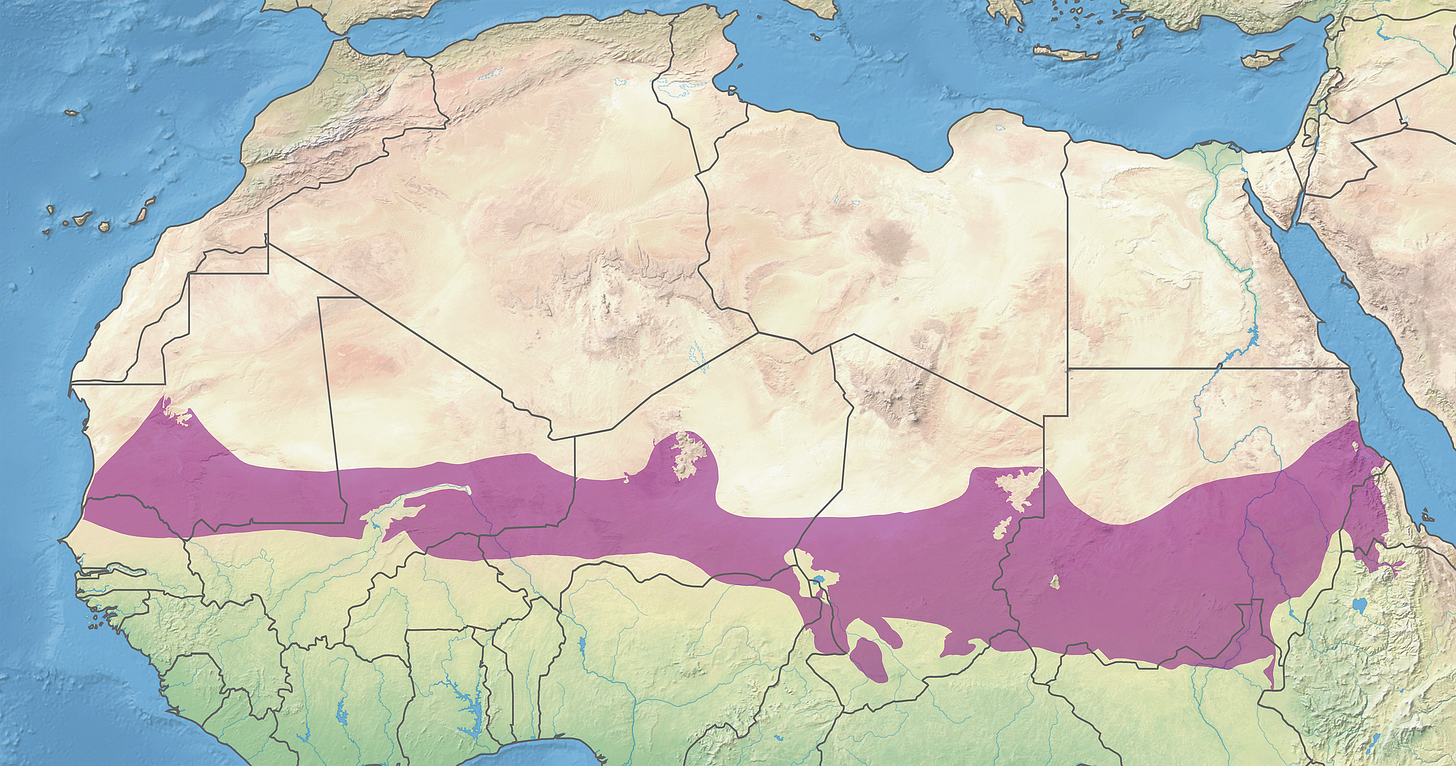 The Sahel is an ecoregion in Africa directly south of the Sahara Desert with a hot, semi-arid climate supporting a wide array of diverse wildlife.