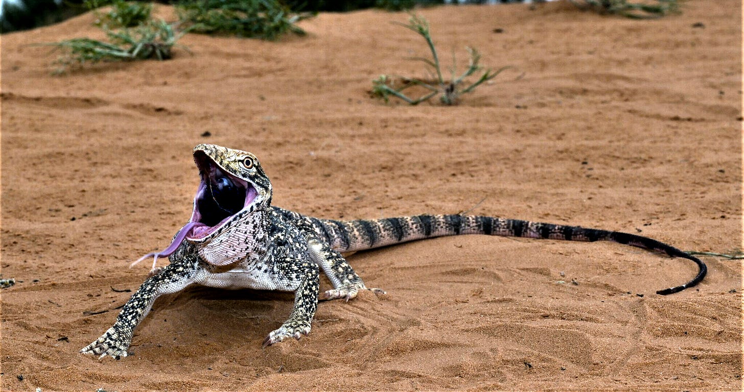 The Desert Monitor is a type of monitor lizard native to Africa, including the Sahel. They are large lizards, averaging around 1 m (3.3 ft) in length and reaching up to 2 m (6.6 ft). Unable to tolerate cold temperatures, they hibernate from September to April. Upon awakening, they gorge on mice, eggs, and fish.