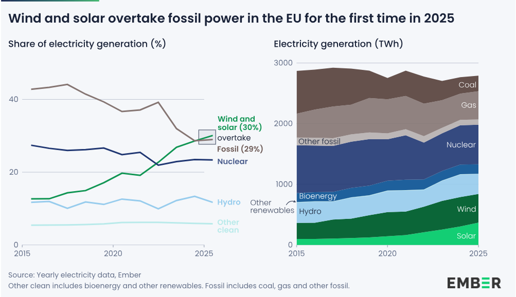 Wind and solar together now generate more electricity in the European Union (EU) than fossil fuels, according to an analysis by energy think-tank Ember. In 2025, the bloc generated 16.9% from wind and 13.2% from solar, combining for a total of 31.1%. In contrast, it generated 29% from fossil fuels, mostly gas and coal.