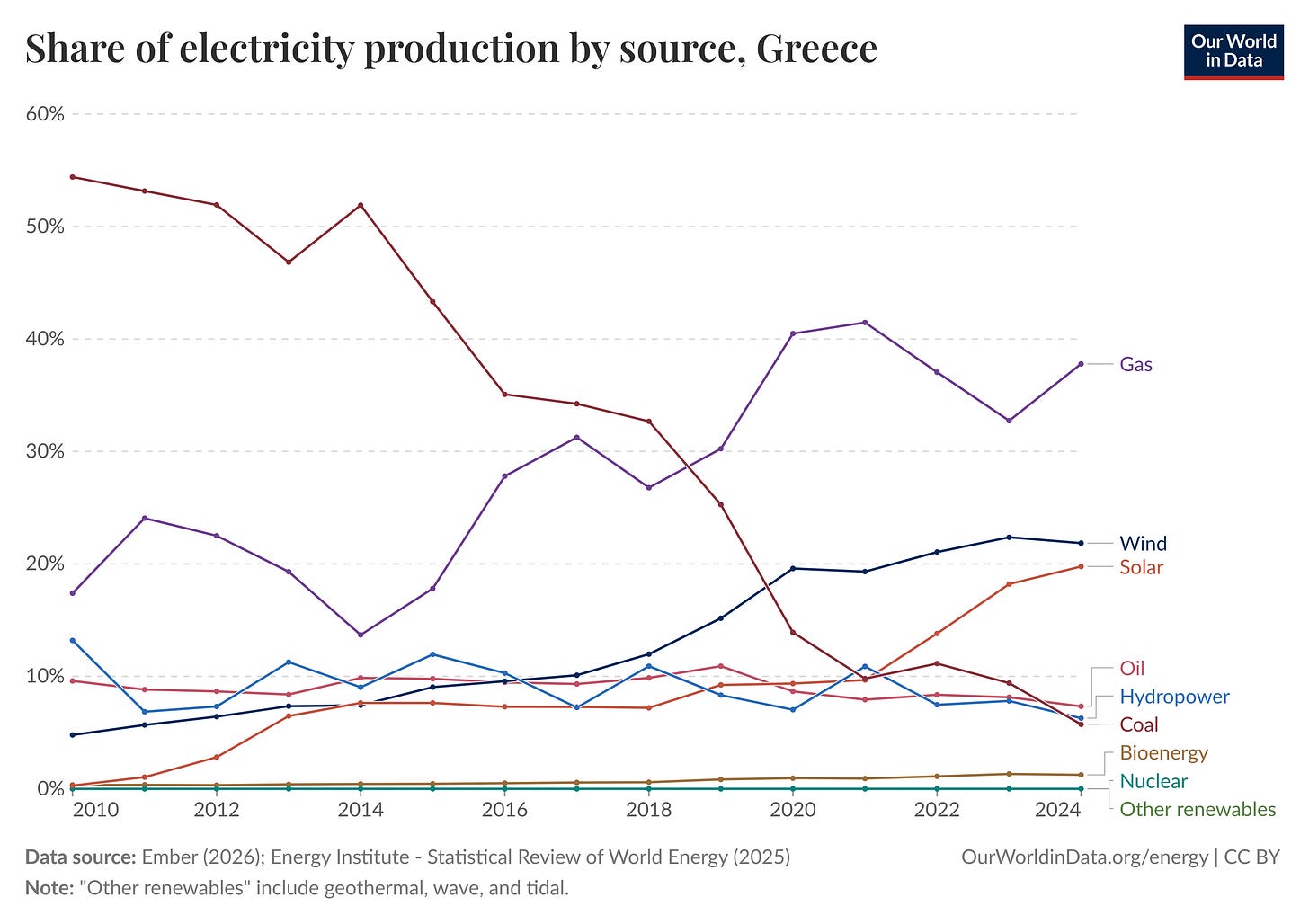 Greece has become a quiet decarbonization superstar, as it has sharply reduced its coal use in favor of wind, solar, and some fossil gas. The sunny Aegean nation plans to eliminate coal from the grid this year.