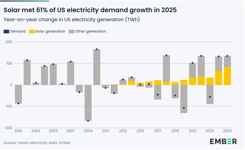 Solar is dominating new electricity generation in the United States, meeting 61% of demand growth in 2025. According to energy think-tank Ember, solar generated 387 TWh of electricity in the US last year - 83 TWh more than in 2024. Solar now accounts for 8.5% of all US generation.