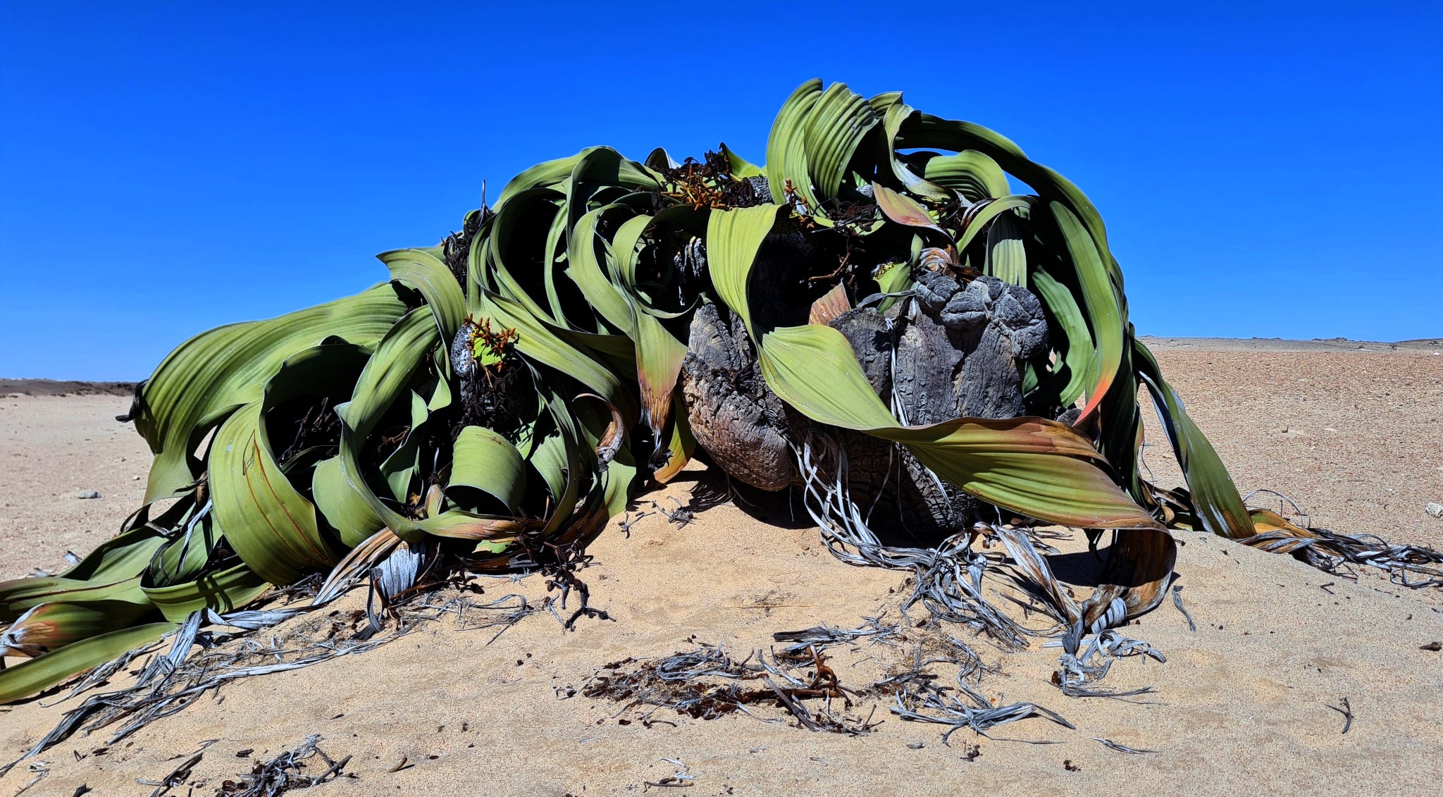It is indeed one of the longest-living of all plant species, with some individuals dated to nearly 2,000 years old. Uniquely, while most plants grow new leaves either every season or every few years - Welwitschia only grows two leaves over the course of its entire life. Each grows extremely slowly over centuries and coils over the other.